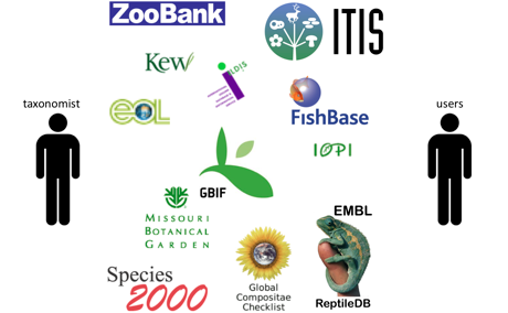 It seems to me that most taxonomic databases are little more than digitised 5x3 index cards, and lack any details on the provenance of the names they contain. They often don't have links to the primary literature, and if they do cite that literature they typically do so in a way that makes it hard to find the actual publication. I once gave a talk which included the slide below showing taxonomic databases as being "in the way" between taxonomists and users of taxonomic information:
